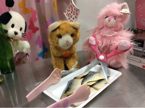 お魚料理は魚大好物のにゃん達に♪茶色いにゃん:「30%引きだったにゃん♪」と飛び上がって喜んでます!ところで。。。にゃん?サバをバッサバッサと女の子のねこちゃん達が♪にゃんまげ:「焼くの得意です!」にゃんだけにトングも肉球〜♪こんがり焼けたらOK!付…